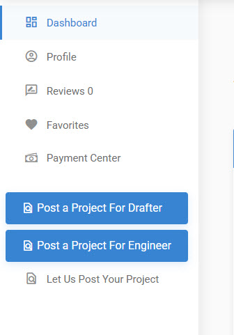 To begin creating a project on Drafting Marketplace login to your main dashboard. Then, click the Post a Project icon on the navigation menu on the left side of your screen.